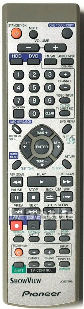 Standby / On, Mute, One Touch Copy, Volume-, Volume+, HDD, DVD, FM / AM, Audio Input Dig/Ana, 1, 2, 3, 4, 5, 6, 7, 8, 9, 0, ShowView, Clear, Channel+, Channel-, Video Input / TV/DVD, TV Direct Rec, Disc Navigator / Top Menu / SR+, DVD Menu / Play List / System Setup, Up / Tune+, Down / Tune-, Right / ST+, Left / ST-, Enter, Home Menu / Test Tone, Return / CH Level, << Rev Scan, Play, FWD Scan >>, Pause, Stop, CM Back, CM Skip, I<< Prev, Next >>I, <II Step/Slow, Step/Slow II>, Rec / Surround, Stop Rec / Advanced, Rec Mode / Dialog, Navi Mark / Sound, Audio, Subtitle, Angle, Play Mode, Display / Dimmer, TV Standby/On, TV Channel+, TV Channel-, TV Volume+, TV Volume-, TV Input, Shift