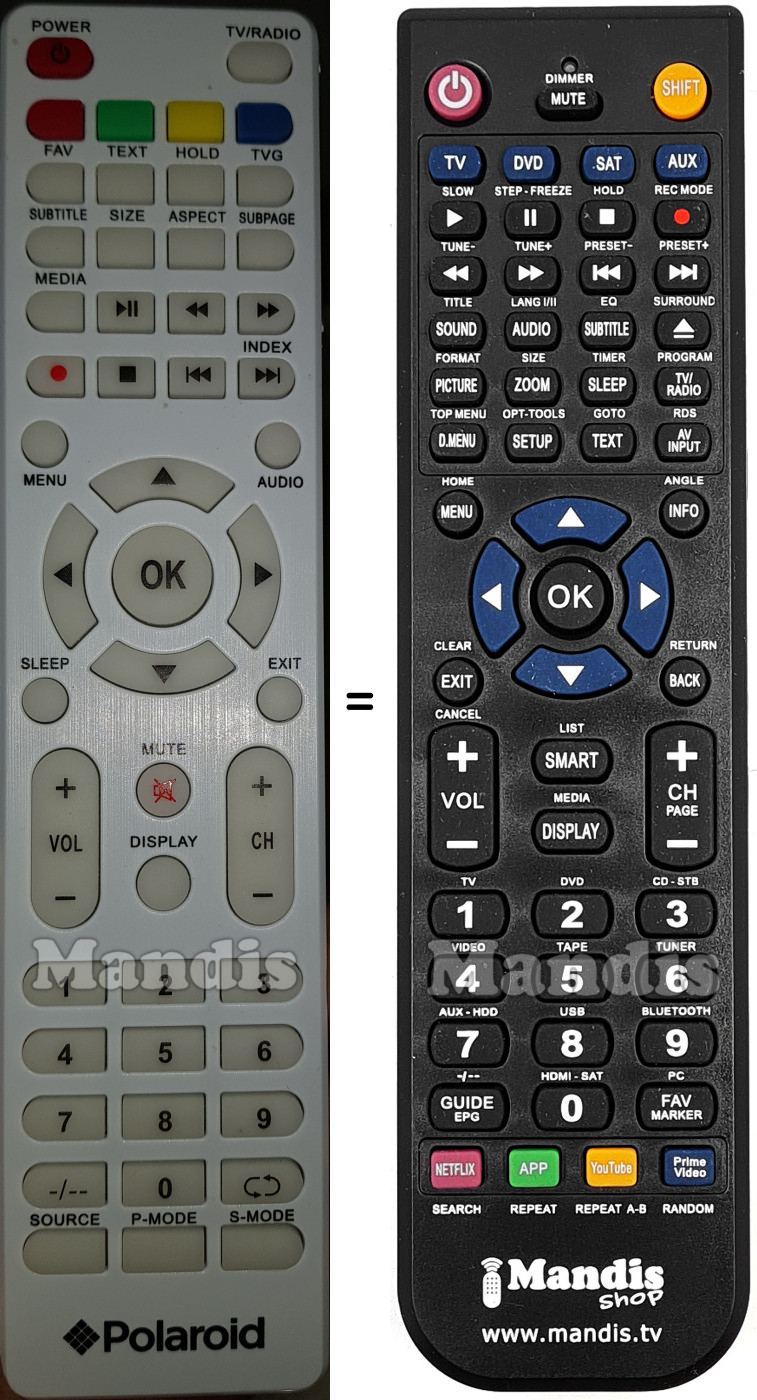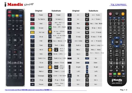 Abaixo, mostraremos a correspondência entre cada botão no controle remoto original e o botão que executa a mesma função no controle remoto de substituição. Em alguns casos, pode ser necessário pressionar a tecla SHIFT antes de pressionar outro botão para realizar determinadas ações. Essas funções adicionais geralmente não são amplamente utilizadas e são incluídas para facilitar o entendimento do controle remoto de substituição, ou porque o controle remoto original tem mais botões do que seu equivalente.