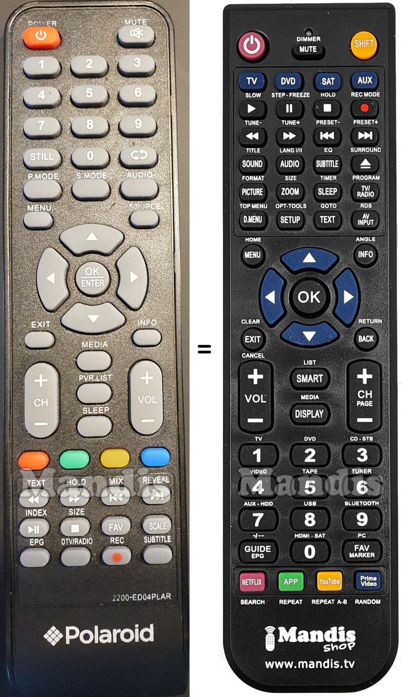 Abaixo, mostraremos a correspondência entre cada botão no controle remoto original e o botão que executa a mesma função no controle remoto de substituição. Em alguns casos, pode ser necessário pressionar a tecla SHIFT antes de pressionar outro botão para realizar determinadas ações. Essas funções adicionais geralmente não são amplamente utilizadas e são incluídas para facilitar o entendimento do controle remoto de substituição, ou porque o controle remoto original tem mais botões do que seu equivalente.