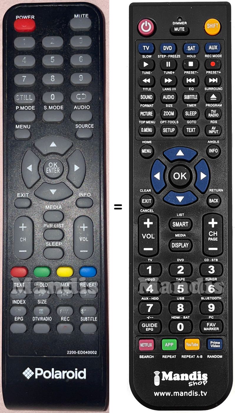 Abaixo, mostraremos a correspondência entre cada botão no controle remoto original e o botão que executa a mesma função no controle remoto de substituição. Em alguns casos, pode ser necessário pressionar a tecla SHIFT antes de pressionar outro botão para realizar determinadas ações. Essas funções adicionais geralmente não são amplamente utilizadas e são incluídas para facilitar o entendimento do controle remoto de substituição, ou porque o controle remoto original tem mais botões do que seu equivalente.