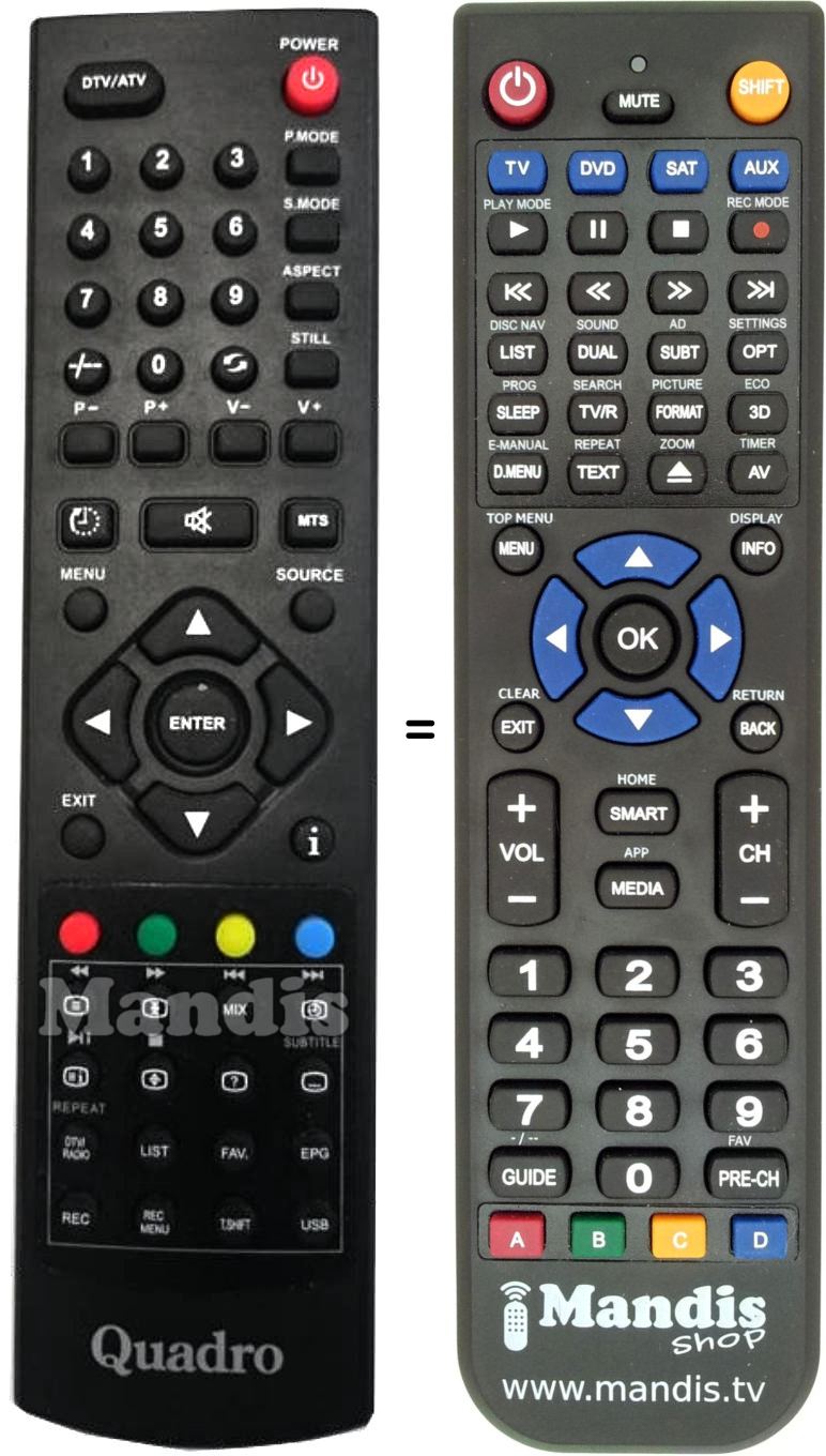 Este controle remoto executa todas as funções do controle remoto original: Power, DTV / ATV, 1, 2, 3, 4, 5, 6, 7, 8, 9, 0, -/--, Recall, P.Mode, S.Mode, Aspect, Still, P -, P +, V -, V +, Sleep, Mute, MTS, Menu, Source, Up, Right, Down, Left, Enter, Exit, i, Red, Green, Yellow, Blue, Text / <<, Hold / >>, Mix / I<<, Clock / >>I, [=i] / Play/Pause, Size / Stop, [ ? ], Subtitle, TV/Radio / Repeat, List, FAV., EPG, Rec, Rec Menu, T.Shift, USB