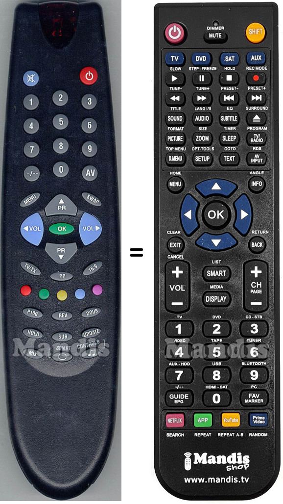 Abaixo, mostraremos a correspondência entre cada botão no controle remoto original e o botão que executa a mesma função no controle remoto de substituição. Em alguns casos, pode ser necessário pressionar a tecla SHIFT antes de pressionar outro botão para realizar determinadas ações. Essas funções adicionais geralmente não são amplamente utilizadas e são incluídas para facilitar o entendimento do controle remoto de substituição, ou porque o controle remoto original tem mais botões do que seu equivalente.