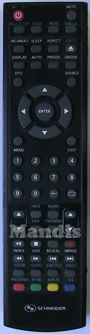 POWER, MUTE, DVD Setup, TITLE, MENU, USB/CR, NICAM/A2, SLEEP, ASPECT, EJECT, DISPLAY, AUTO, PMODE, SMODE, DTV, SOURCE, MENU, EXIT, ENTER, UP, DOWN, RIGHT, LEFT, 1, 2, 3, 4, 5, 6, 7, 8, 0, 0, -/--, BACK, VOL+, INFO, FAV, AUDIO, TV/RADIO, VOL-, PR-, PLAY/PAUSE/TEXT, STOP/EPG, SUBTITLE, REC/HOLD, <</INDEX, >>/SIZE, I<</REVEAL, >>I/SBPAGE, ZOOM, GOTO, SUBTITLE, ANGLE, RED/PROGRAM, GREEN/INTRO, YELLOW/REPEAT, BLUE/AB, PR+