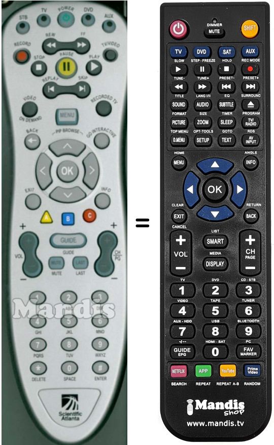 Comando à distância que substitui o original ScientificAtlanta001 em todas as suas funções.