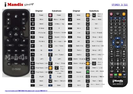 Abaixo, mostraremos a correspondência entre cada botão no controle remoto original e o botão que executa a mesma função no controle remoto de substituição. Em alguns casos, pode ser necessário pressionar a tecla SHIFT antes de pressionar outro botão para realizar determinadas ações. Essas funções adicionais geralmente não são amplamente utilizadas e são incluídas para facilitar o entendimento do controle remoto de substituição, ou porque o controle remoto original tem mais botões do que seu equivalente.