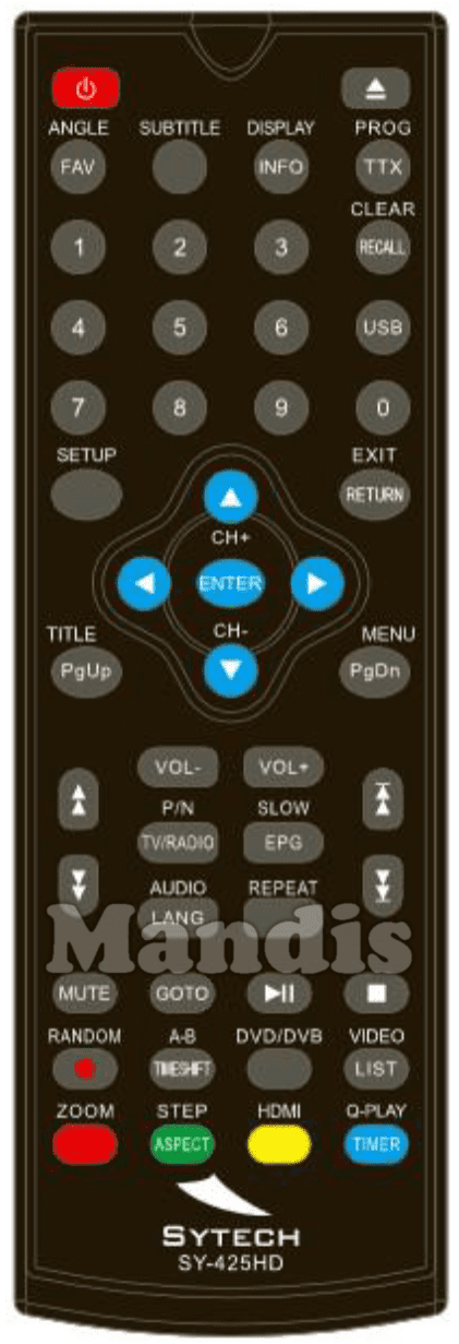 Power, Open / Close, FAV / Angle, Subtitle, Display / Info, TTX / Prog, Recall / Clear, 1, 2, 3, 4, 5, 6, 7, 8, 9, 0, USB, Setup, Return / Exit, Up / CH+, Left, Enter, Right, Down / CH-, PgUp / Title, PgDn / Menu, >>, <<, Vol-, Vol+, TV/Radio / P/N, EPG / Slow, Lang / Audio, Repeat, >>I, I<<, Mute, Goto, Play / Pause, Stop, Rec / Random, Timeshift / A-B, DVD / DVB, List / Video, Red / Zoom, Green / Aspect / Step, Yellow / HDMI, Blue / Timer / Q-Play