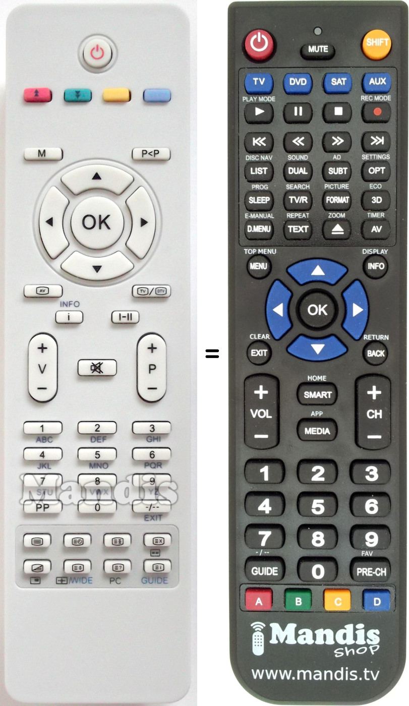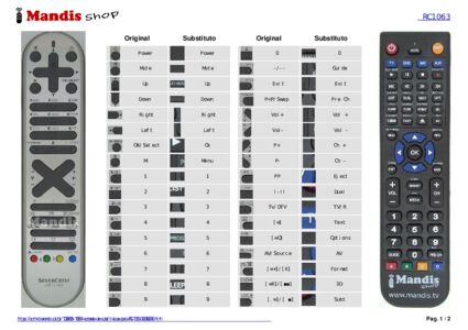 Abaixo, mostraremos a correspondência entre cada botão no controle remoto original e o botão que executa a mesma função no controle remoto de substituição. Em alguns casos, pode ser necessário pressionar a tecla SHIFT antes de pressionar outro botão para realizar determinadas ações. Essas funções adicionais geralmente não são amplamente utilizadas e são incluídas para facilitar o entendimento do controle remoto de substituição, ou porque o controle remoto original tem mais botões do que seu equivalente.