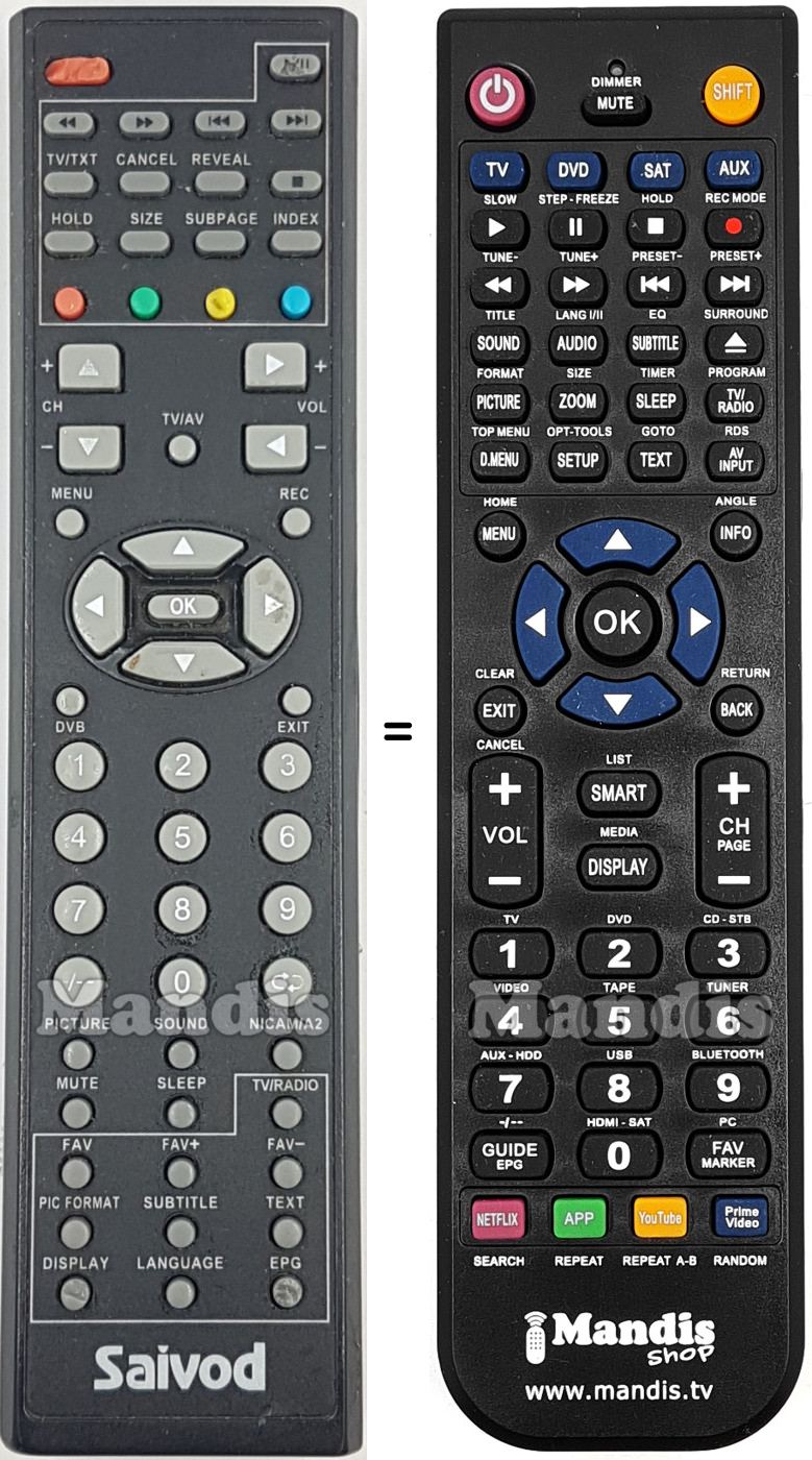 Abaixo, mostraremos a correspondência entre cada botão no controle remoto original e o botão que executa a mesma função no controle remoto de substituição. Em alguns casos, pode ser necessário pressionar a tecla SHIFT antes de pressionar outro botão para realizar determinadas ações. Essas funções adicionais geralmente não são amplamente utilizadas e são incluídas para facilitar o entendimento do controle remoto de substituição, ou porque o controle remoto original tem mais botões do que seu equivalente.