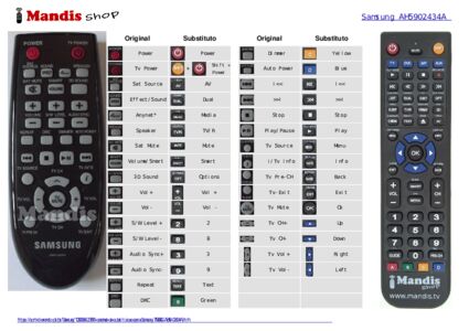 Este controle remoto executa todas as funções do controle remoto original: power, tv power, sat source, effect/sound, anynet*, speaker, sat mute, volume/smart, 3d sound, vol+, vol-, s/w level+, s/w level-, audio sync +, audio sync -, repeat, drc, dimmer, auto power, i<<, >>i, stop, play/pause, tv source, tv info, tv pre-ch, tv exit, tv mute, up , down, right, left