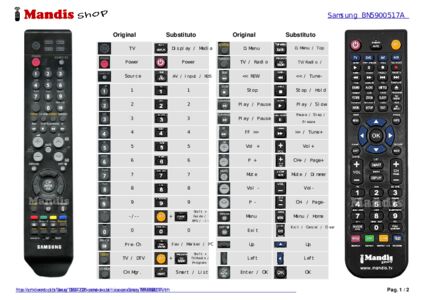 Este controle remoto executa todas as funções do controle remoto original: TV, DVD, STB, CABLE, VCR, Power, Source, 1, 2, 3, 4, 5, 6, 7, 8, 9, 0, -/--, Pre-Ch, TV / DTV, CH. Mgr., D.Menu, TV / Radio, << REW, Stop, Play / Pause, FF >>, Vol +, Vol -, Mute, P +, P -, Menu, Exit, Up, Right, Down, Left, Enter / OK, Guide, Info, TTX / Mix, Red, Green, Yellow, Blue, PIP, Dual I-II, Still, Subtitle, Text, Back, Alt, APP
