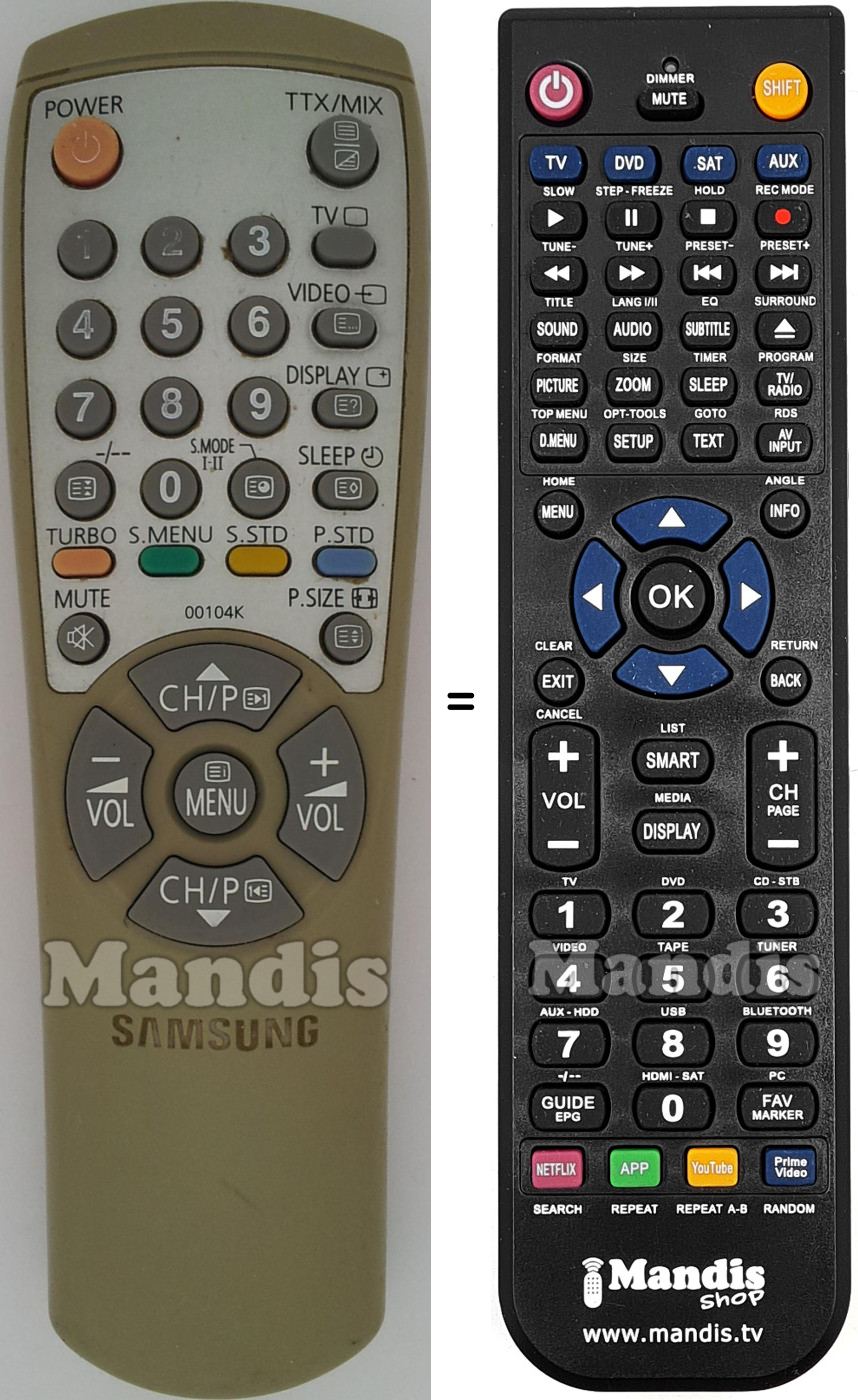 Abaixo, mostraremos a correspondência entre cada botão no controle remoto original e o botão que executa a mesma função no controle remoto de substituição. Em alguns casos, pode ser necessário pressionar a tecla SHIFT antes de pressionar outro botão para realizar determinadas ações. Essas funções adicionais geralmente não são amplamente utilizadas e são incluídas para facilitar o entendimento do controle remoto de substituição, ou porque o controle remoto original tem mais botões do que seu equivalente.