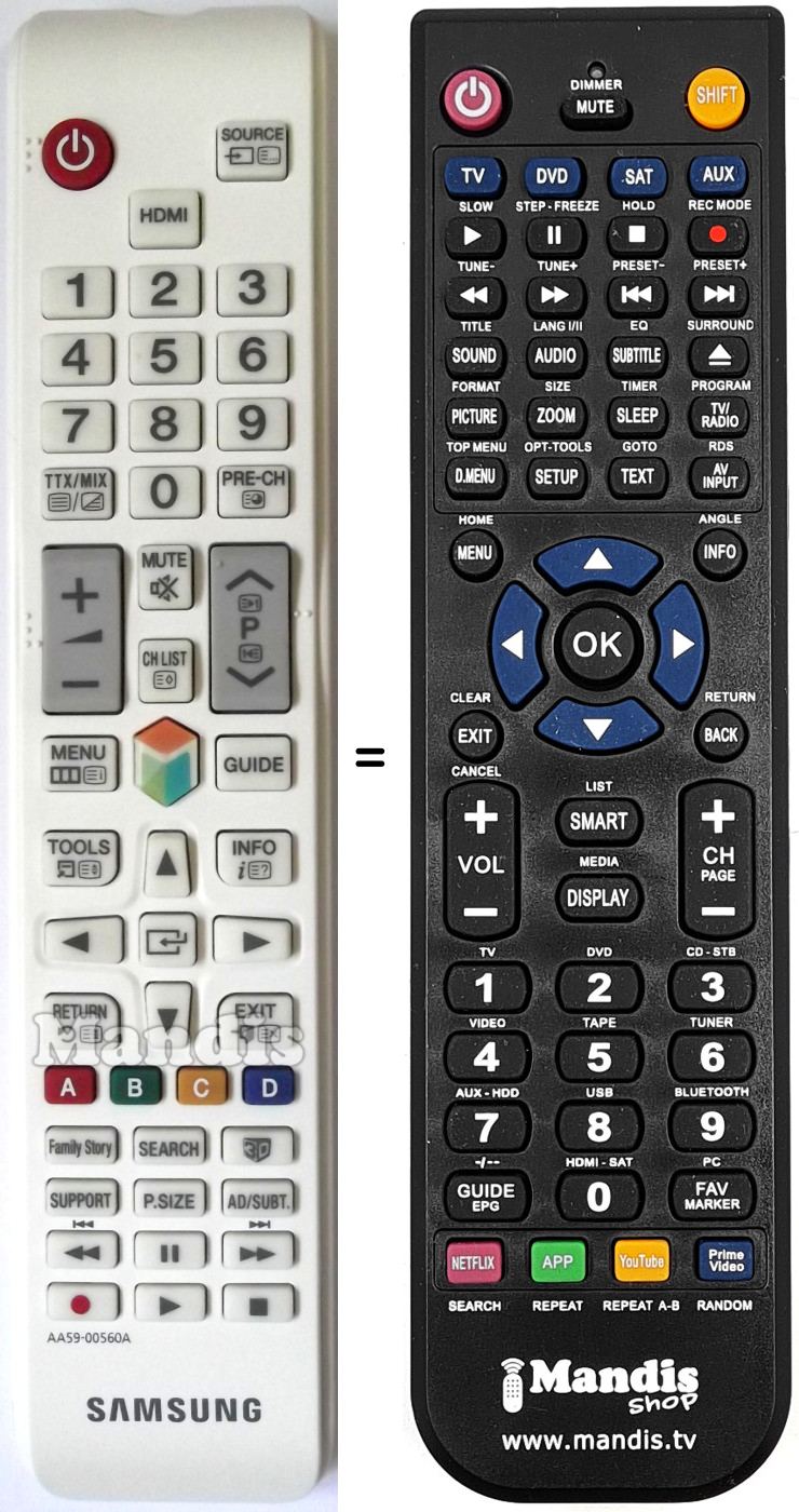 Comando à distância que substitui o original AA59-00560A em todas as suas funções. Não se trata de um comando universal, mas sim de um comando que substitui o original. Receberá um comando completamente pronto. Para fazê-lo funcionar, basta colocar as pilhas. Não é necessário programá-lo. Damos-lhe total garantia de que o comando cumprirá com as mesmas funções do comando original.