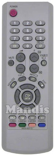 Power, 1, 2, 3, 4, 5, 6, 7, 8, 9, [≡⧗]/-/--, 0, PRE-CH, Mute, Vol+, Vol-, P+/[≡>1], P-/[1<≡], Source, Menu [II], TV, Info [ ⁺], Exit, Up, Down, Left, Right, Enter, TTX/Mix, Dual I-II, P.Size, Sleep ◴, Red/Turbo, Green/S.Menu, Yellow/S.Mode, Blue/P.Mode