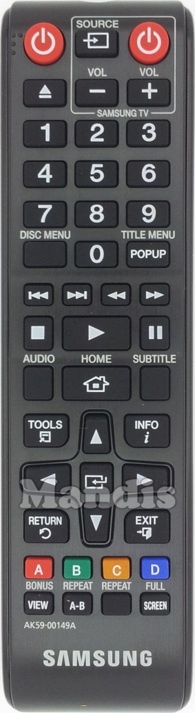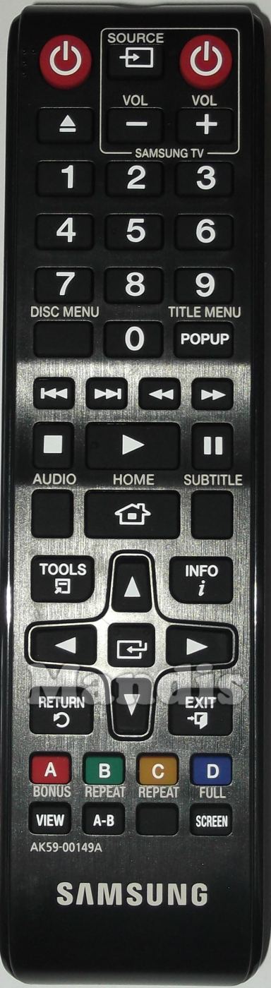 Power, Power Tv, Source Tv, Vol+ Tv, Vol- Tv, Open/Close, 1, 2, 3, 4, 5, 6, 7, 8, 9, 0, Disc Menu, Popup/Title Menu, I<<, >>I, <<, >>, Stop, Play, Pause, Audio, Home, Subtitle, Tools, Info, Return, Exit, Enter, Up, Down, Right, Left, Red/A, Green/B, Yellow/C, Blue/D, View/Bonus, A-B/Repeat, Repeat, Screen/Full