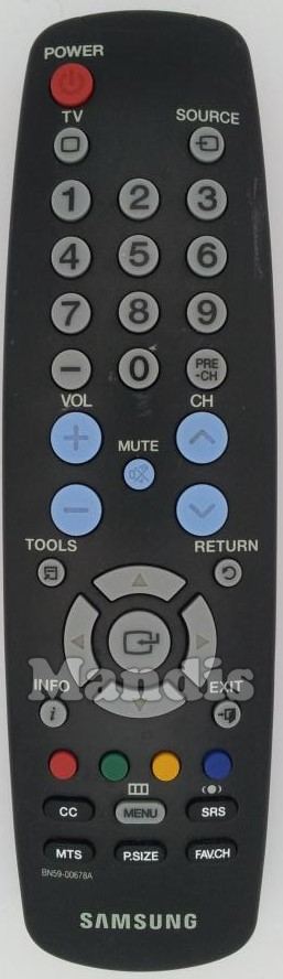 Power, Source, TV, 1, 2, 3, 4, 5, 6, 7, 8, 9, 0, -, PRE-CH, Vol+, CH+, Mute, Vol-, Return, Tools, Return, Info, Exit, Up, Down, Right, Left, Enter, Red, Green, Yellow, Blue, CC, Menu, SRS, P.Size, FAV/CH, MTS