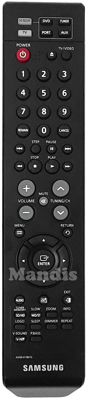 DVD Receiver, TV, DVD, TUNER, PORT, AUX, Power, Open/Close, TV/Video, 1, 2, 3, 4, 5, 6, 7, 8, 9, 0, Remain, Cancel, I<<, Step, Pause, >>I, <<, Stop, Play, >>, Volume+, Volume-, Mute, Tunning/CH+, Tunning/CH-, Menu, Return, Up, Left, Enter, Right, Down, Audio, Sub Title, Exit, SD/HD / Tuner Memory, Mo/St / Slow, Zoom, Info, Logo, Sleep, Dimmer, Repeat, V-H/P / V-Sound, P.Bass