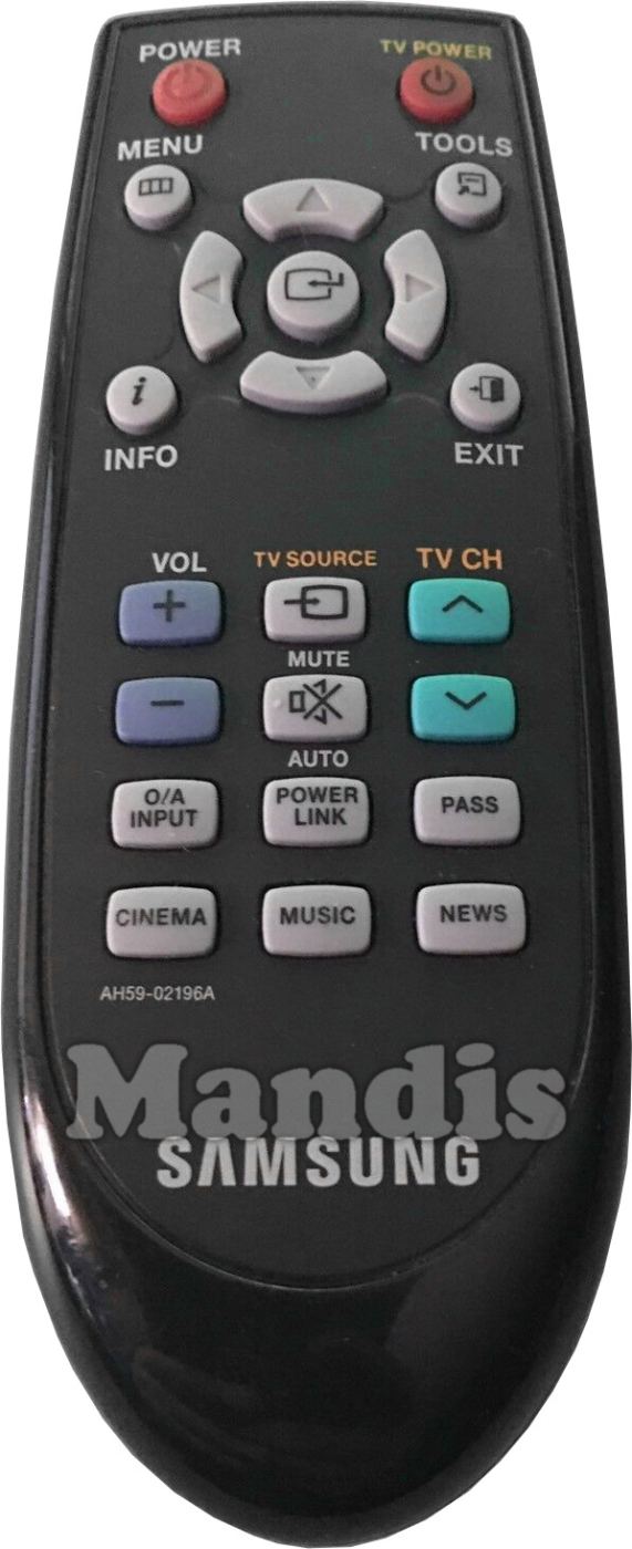Power, TV Power, Menu, Tools, Up, Down, Right, Left, Enter, Info, Exit, Vol +, Vol -, TV Source, Mute, TV CH +, TV CH -, O/A INput, Power Link / Auto, Pass, Cinema, Music, News