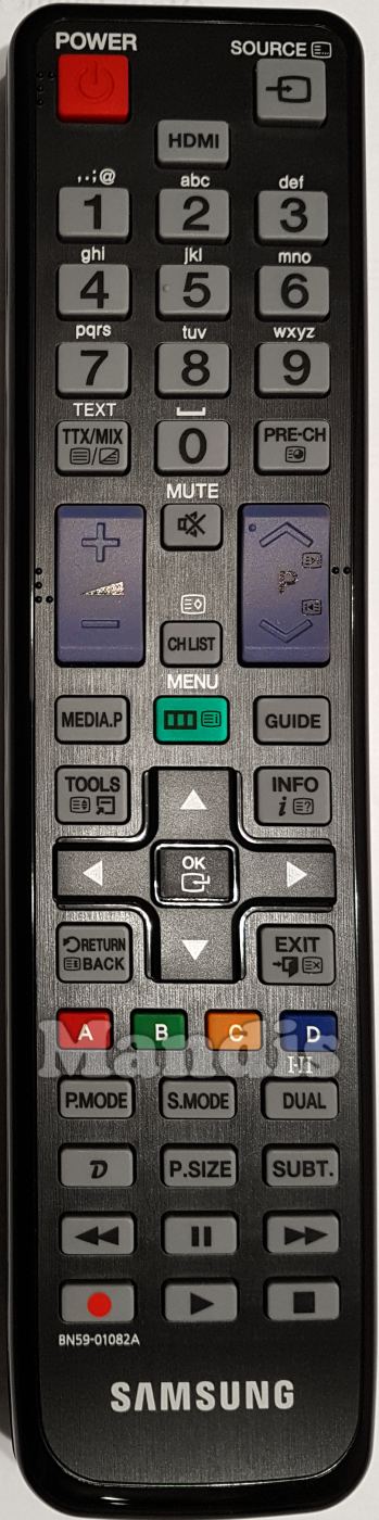 Poert, Source, HDMI, 1, 2, 3, 4, 5, 6, 7, 8, 9, 0, TTX / MIX, PRE-CH, Vol +, Vol -, Mute, CH List, P +, P -, Media.P, Menu, Guide, Tools, Info, Up, Left, OK, Right, Down, Return / Back, Exit, Red, Green, Yellow, Blue, P.Mode, S.Mode, Diañ I-II, D, P.Size, Subt., <<, Pause, >>, Rec, Play, Stop
