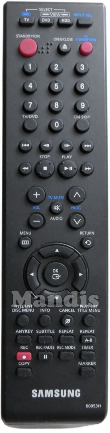 TV, DVD, HDD, Input Sel, Standby / On, Open / Close, TV Standby / On, 1, 2, 3, 4, 5, 6, 7, 8, 9, 0, TV / DVD, CM Skip, I<<, <II, II>, >>I, <<, Stop, Play / Pause, >>, Vol +, Vol -, TV Mute / Audio, Prog +, Prog -, Menu, Return, Up, Left, OK, Right, Down, Title List / Disc Menu, Info, Cancel, Play List / Title Menu, Anykey, Subtitle, Repeat, Repeat A-B, Rec, Rec Pause, Rec Mode, Timer, Copy, Marker