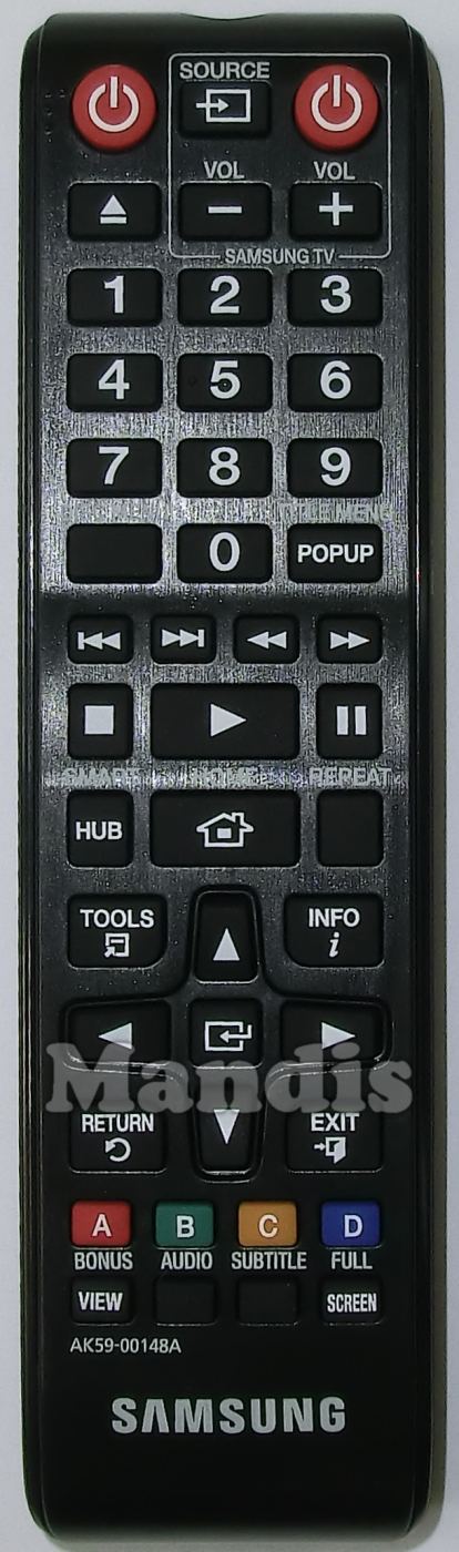 Power, Open/Close, 1, 2, 3, 4, 5, 6, 7, 8, 9, 0, Disc Menu, Popup Menu, I<<, >>I, <<, >>, Stop, Pause, Play, Hub Smart, Repeat, Home, Tools, Info, Return, Exit, Up, Down, Right, Left, Enter, Red, Green, Yellow, Blue, View/Bonus, Audio, Subtitle, Screen/Full, Power Tv, Source Tv, Vol- Tv, Vol+ Tv