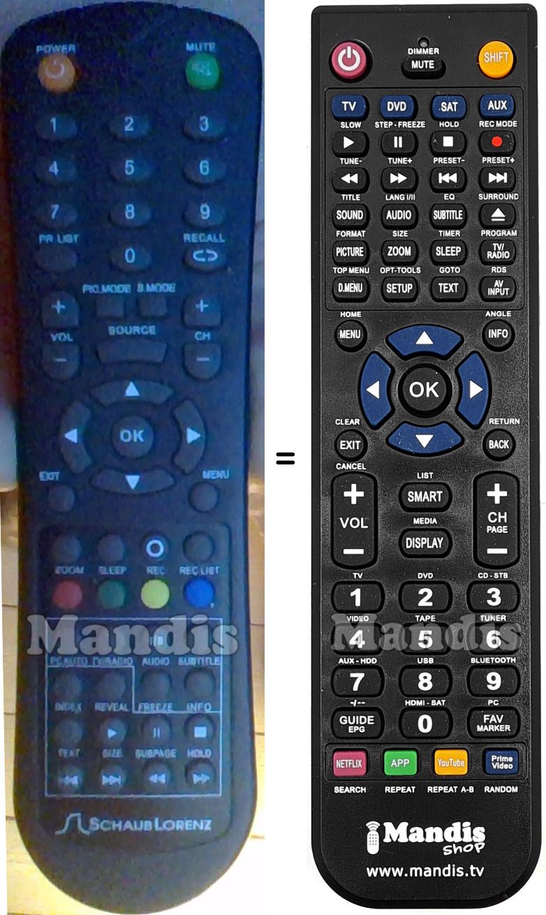Abaixo, mostraremos a correspondência entre cada botão no controle remoto original e o botão que executa a mesma função no controle remoto de substituição. Em alguns casos, pode ser necessário pressionar a tecla SHIFT antes de pressionar outro botão para realizar determinadas ações. Essas funções adicionais geralmente não são amplamente utilizadas e são incluídas para facilitar o entendimento do controle remoto de substituição, ou porque o controle remoto original tem mais botões do que seu equivalente.