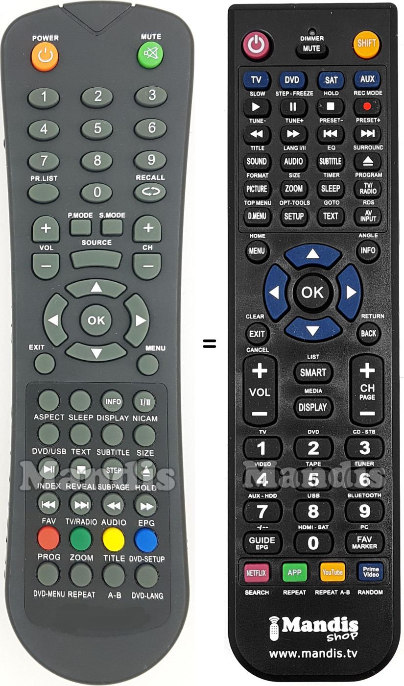 Abaixo, mostraremos a correspondência entre cada botão no controle remoto original e o botão que executa a mesma função no controle remoto de substituição. Em alguns casos, pode ser necessário pressionar a tecla SHIFT antes de pressionar outro botão para realizar determinadas ações. Essas funções adicionais geralmente não são amplamente utilizadas e são incluídas para facilitar o entendimento do controle remoto de substituição, ou porque o controle remoto original tem mais botões do que seu equivalente.