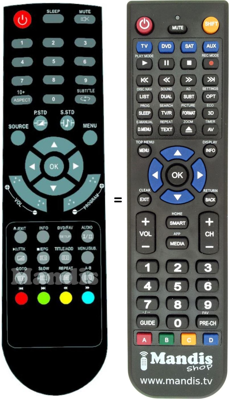 Abaixo, mostraremos a correspondência entre cada botão no controle remoto original e o botão que executa a mesma função no controle remoto de substituição. Em alguns casos, pode ser necessário pressionar a tecla SHIFT antes de pressionar outro botão para realizar determinadas ações. Essas funções adicionais geralmente não são amplamente utilizadas e são incluídas para facilitar o entendimento do controle remoto de substituição, ou porque o controle remoto original tem mais botões do que seu equivalente.