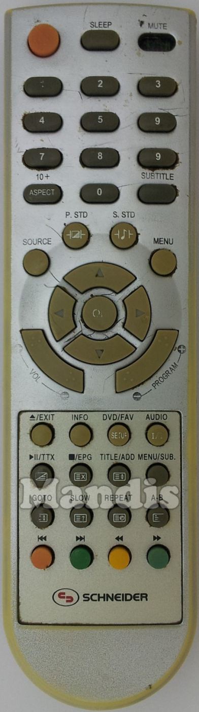 Power, Sleep, Mute, 1, 2, 3, 4, 5, 6, 7, 8, 9, 0, Aspect / 10+, Subtitle, Source, P.Std, S.Std, Menu, Up, Down, Right, Left, OK, Vol +, Vol -, Program +, Program -, Eject / Exit, Info, Setup / DVD / Fav, Audio, Play / Pause / TTX, Stop / Epg, Title / Add, Menu / Sub., Goto, Slow, Repeat, A-B, Red / I<<, Green / >>I, Yellow / <<, Blue / >>