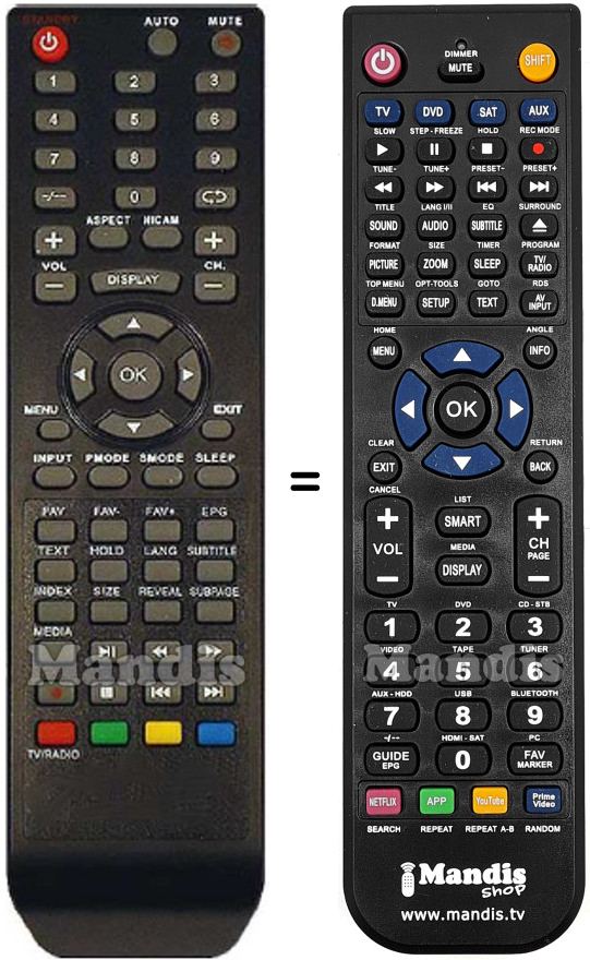 Abaixo, mostraremos a correspondência entre cada botão no controle remoto original e o botão que executa a mesma função no controle remoto de substituição. Em alguns casos, pode ser necessário pressionar a tecla SHIFT antes de pressionar outro botão para realizar determinadas ações. Essas funções adicionais geralmente não são amplamente utilizadas e são incluídas para facilitar o entendimento do controle remoto de substituição, ou porque o controle remoto original tem mais botões do que seu equivalente.