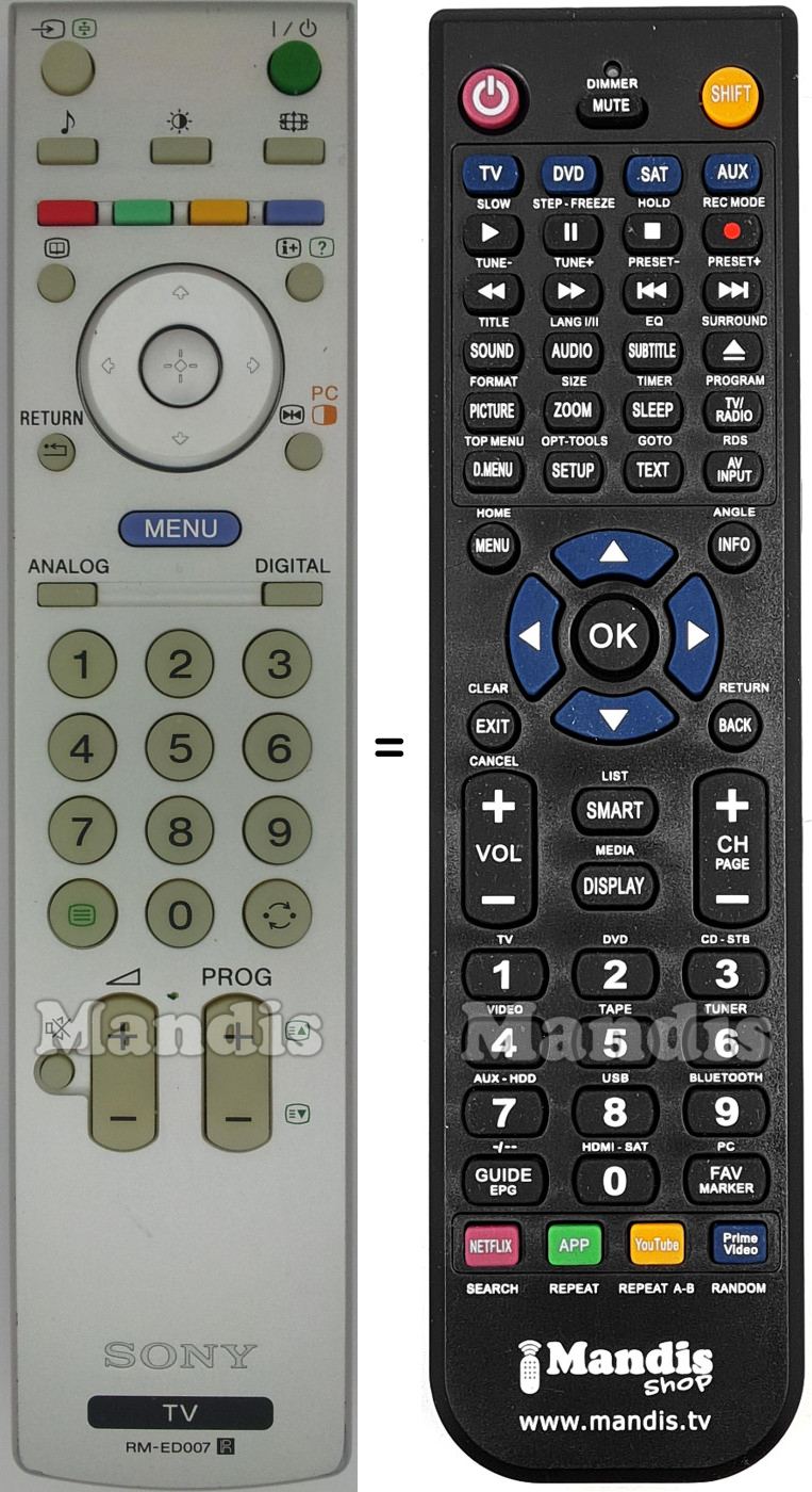 Abaixo, mostraremos a correspondência entre cada botão no controle remoto original e o botão que executa a mesma função no controle remoto de substituição. Em alguns casos, pode ser necessário pressionar a tecla SHIFT antes de pressionar outro botão para realizar determinadas ações. Essas funções adicionais geralmente não são amplamente utilizadas e são incluídas para facilitar o entendimento do controle remoto de substituição, ou porque o controle remoto original tem mais botões do que seu equivalente.