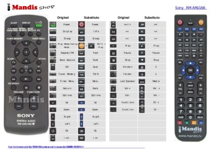 Este controle remoto executa todas as funções do controle remoto original: Power, Sleep, Display, Play Mode/Tuning Mode, Repeat/FM Mode, Bass Bazuca, EQ, Tuner Memory, Timer Menu, Options, Return, Down, Up, Right, Left, OK, I<</-, >>I/+, Folder-, Folder+, PLay, <<, >>, Stop, Pause, Led Speaker, Vol+, Vol-, Function+, Function-