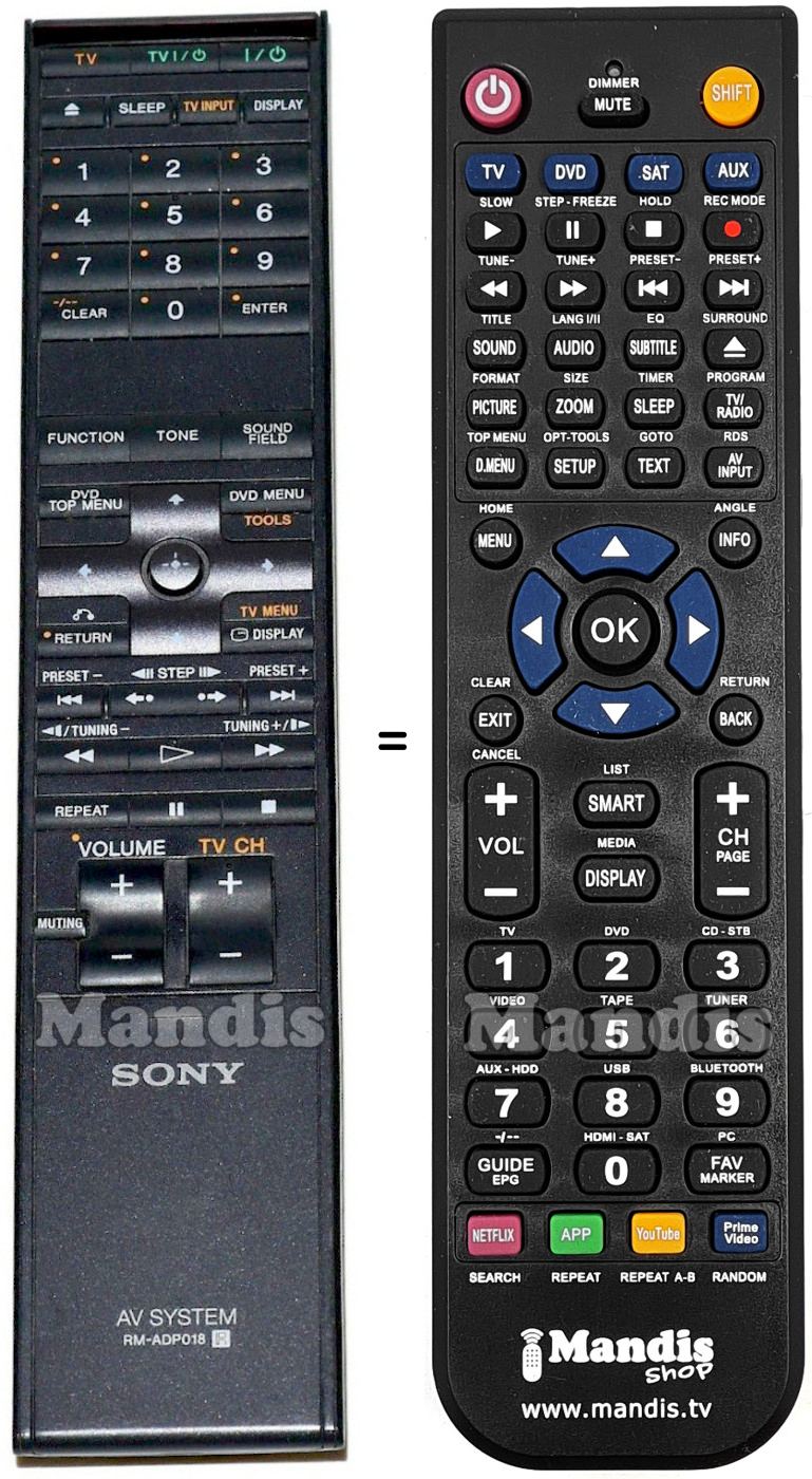 Este controle remoto substitui a maioria das funções do seu RM-ADP018. Não é um controle remoto universal, mas sim uma cópia com a maioria dos botões e funções do seu original.