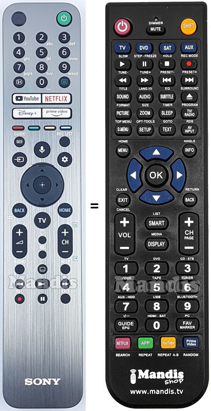 Abaixo, mostraremos a correspondência entre cada botão no controle remoto original e o botão que executa a mesma função no controle remoto de substituição. Em alguns casos, pode ser necessário pressionar a tecla SHIFT antes de pressionar outro botão para realizar determinadas ações. Essas funções adicionais geralmente não são amplamente utilizadas e são incluídas para facilitar o entendimento do controle remoto de substituição, ou porque o controle remoto original tem mais botões do que seu equivalente.