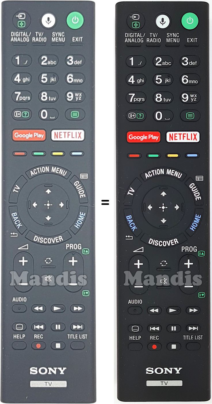 Este controle remoto possui os seguintes botões: Power, Mic, Input, Digital / Analog, TV / Radio, Sync Menu, Exit, 1, 2, 3, 4, 5, 6, 7, 8, 9, 0, [i+] [?], Text, Google Play, Netflix, Red, Green, Yellow, Blue, Action Menu, TV, Guide, Up, Left, Enter, Right, Down, Back, Discover, Home, Vol+, Vol-, Recall, Mute, Prog+, Prog-, Audio, <<, Play, >>, Subtitle, I<<, Pause, >>I, Help, Rec, Stop, Title List