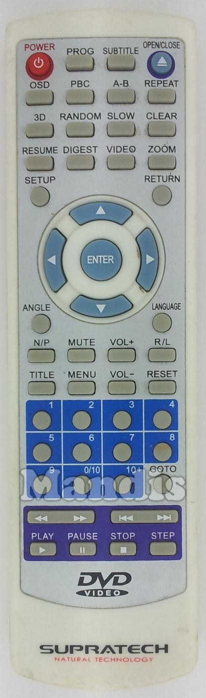 Power, PROG., Subtitle, Open/Close, OSD, PBC, A-B, Repeat, 3D, Random, Slow, Clear, Resume, Digest, Video, Zoom, Setup, `Return, Angle, Language, Up, Down, Left, Right, Enter, N/P, Mute, Vol+, R/L, Title, Menu, Vol-, Reset, 1, 2, 3, 4, 5, 6, 7, 8, 9, 0/10, 10+, GOTO, <<, >>, I<<, >>I, Play, Pause, Stop, Step