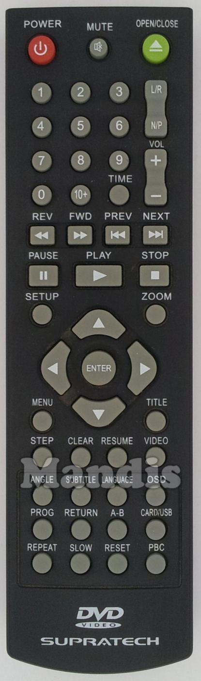 Power, Mute, Open/Close, L/R, N/P, Vol+, Vol-, Time, 1, 2, 3, 4, 5, 6, 7, 8, 9, 0, 10+, <</REV, >>/FWD, I<</Prev, >>I/Next, Pause, Stop, Play, Setup, Zoom, Menu, Title, Up, Down, Right, Left, Enter, Step, Clear, Resume, Video, Angle, Subtitle, Language, OSD, A-B, Prog, Return, Card/USB, Repeat, Slow, Reset, PBC