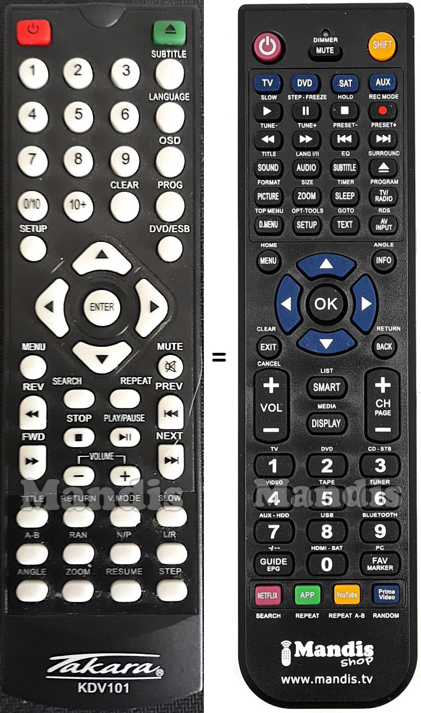 Abaixo, mostraremos a correspondência entre cada botão no controle remoto original e o botão que executa a mesma função no controle remoto de substituição. Em alguns casos, pode ser necessário pressionar a tecla SHIFT antes de pressionar outro botão para realizar determinadas ações. Essas funções adicionais geralmente não são amplamente utilizadas e são incluídas para facilitar o entendimento do controle remoto de substituição, ou porque o controle remoto original tem mais botões do que seu equivalente.