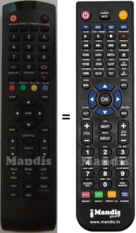 Abaixo, mostraremos a correspondência entre cada botão no controle remoto original e o botão que executa a mesma função no controle remoto de substituição. Em alguns casos, pode ser necessário pressionar a tecla SHIFT antes de pressionar outro botão para realizar determinadas ações. Essas funções adicionais geralmente não são amplamente utilizadas e são incluídas para facilitar o entendimento do controle remoto de substituição, ou porque o controle remoto original tem mais botões do que seu equivalente.