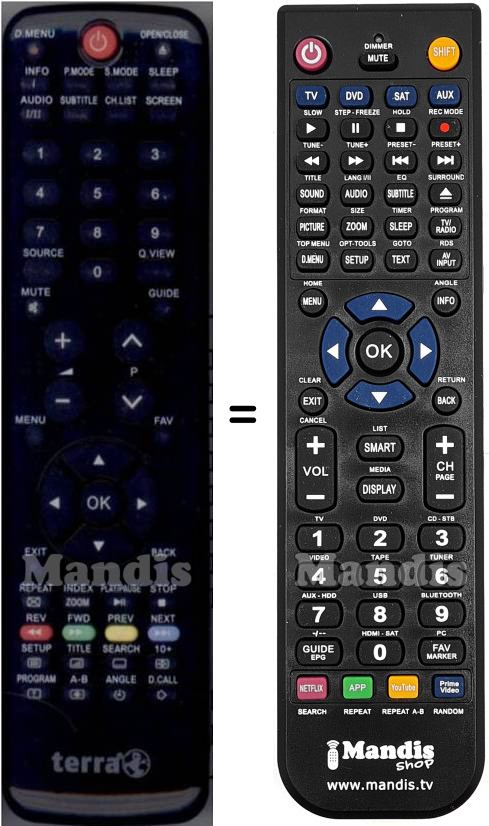 Abaixo, mostraremos a correspondência entre cada botão no controle remoto original e o botão que executa a mesma função no controle remoto de substituição. Em alguns casos, pode ser necessário pressionar a tecla SHIFT antes de pressionar outro botão para realizar determinadas ações. Essas funções adicionais geralmente não são amplamente utilizadas e são incluídas para facilitar o entendimento do controle remoto de substituição, ou porque o controle remoto original tem mais botões do que seu equivalente.