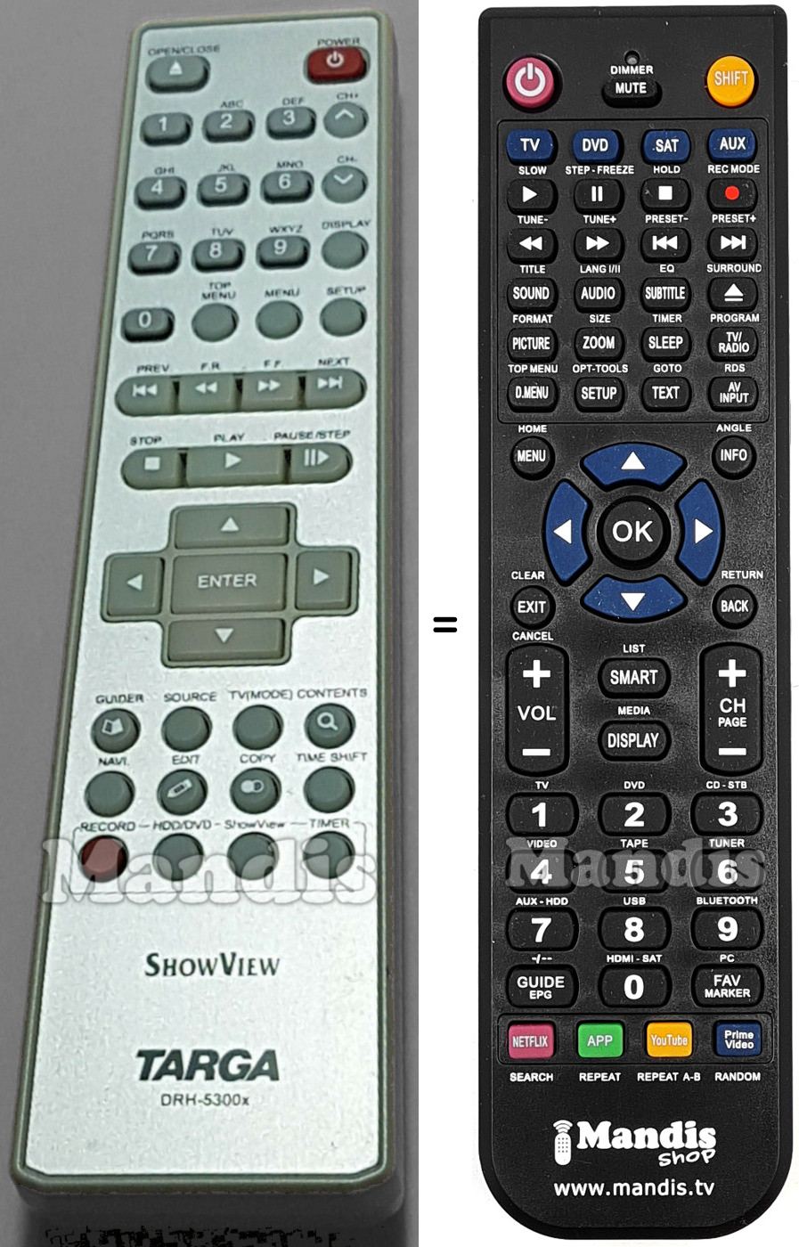 Abaixo, mostraremos a correspondência entre cada botão no controle remoto original e o botão que executa a mesma função no controle remoto de substituição. Em alguns casos, pode ser necessário pressionar a tecla SHIFT antes de pressionar outro botão para realizar determinadas ações. Essas funções adicionais geralmente não são amplamente utilizadas e são incluídas para facilitar o entendimento do controle remoto de substituição, ou porque o controle remoto original tem mais botões do que seu equivalente.