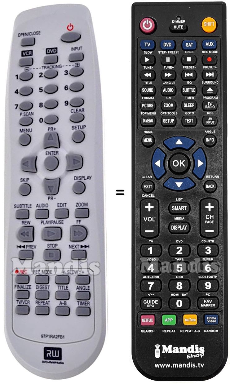 Este controle remoto substitui a maioria das funções do seu 97P1RA2FB1. Não é um controle remoto universal, mas sim uma cópia com a maioria dos botões e funções do seu original.