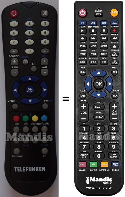 Abaixo, mostraremos a correspondência entre cada botão no controle remoto original e o botão que executa a mesma função no controle remoto de substituição. Em alguns casos, pode ser necessário pressionar a tecla SHIFT antes de pressionar outro botão para realizar determinadas ações. Essas funções adicionais geralmente não são amplamente utilizadas e são incluídas para facilitar o entendimento do controle remoto de substituição, ou porque o controle remoto original tem mais botões do que seu equivalente.