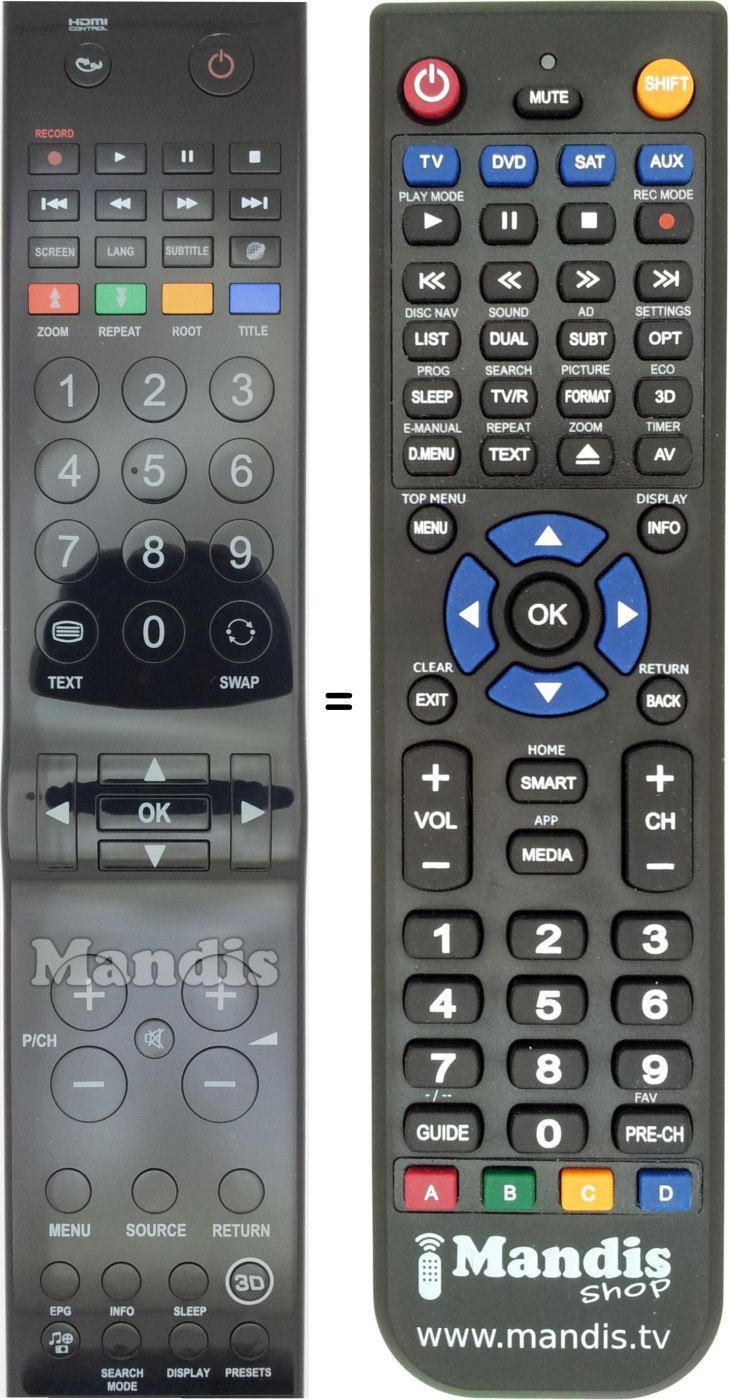 Abaixo, mostraremos a correspondência entre cada botão no controle remoto original e o botão que executa a mesma função no controle remoto de substituição. Em alguns casos, pode ser necessário pressionar a tecla SHIFT antes de pressionar outro botão para realizar determinadas ações. Essas funções adicionais geralmente não são amplamente utilizadas e são incluídas para facilitar o entendimento do controle remoto de substituição, ou porque o controle remoto original tem mais botões do que seu equivalente.