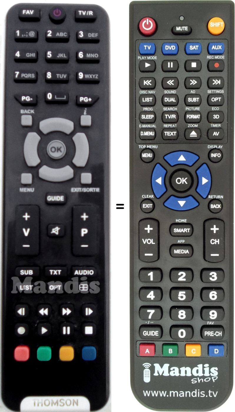 Este controle remoto executa todas as funções do controle remoto original: Power, FAV, TV / R, 1, 2, 3, 4, 5, 6, 7, 8, 9, 0, PG -, PG +, Back, i, Up, Left, OK, Right, Down, Menu, Exit / Sortie, Guide, V +, V -, P +, P -, Mute, SUB, TXT, Audio, List, OPT, Aspect, <I, <<, >>, I>, Rec, Play, Pause, Stop, Red, Green, Yellow, Blue