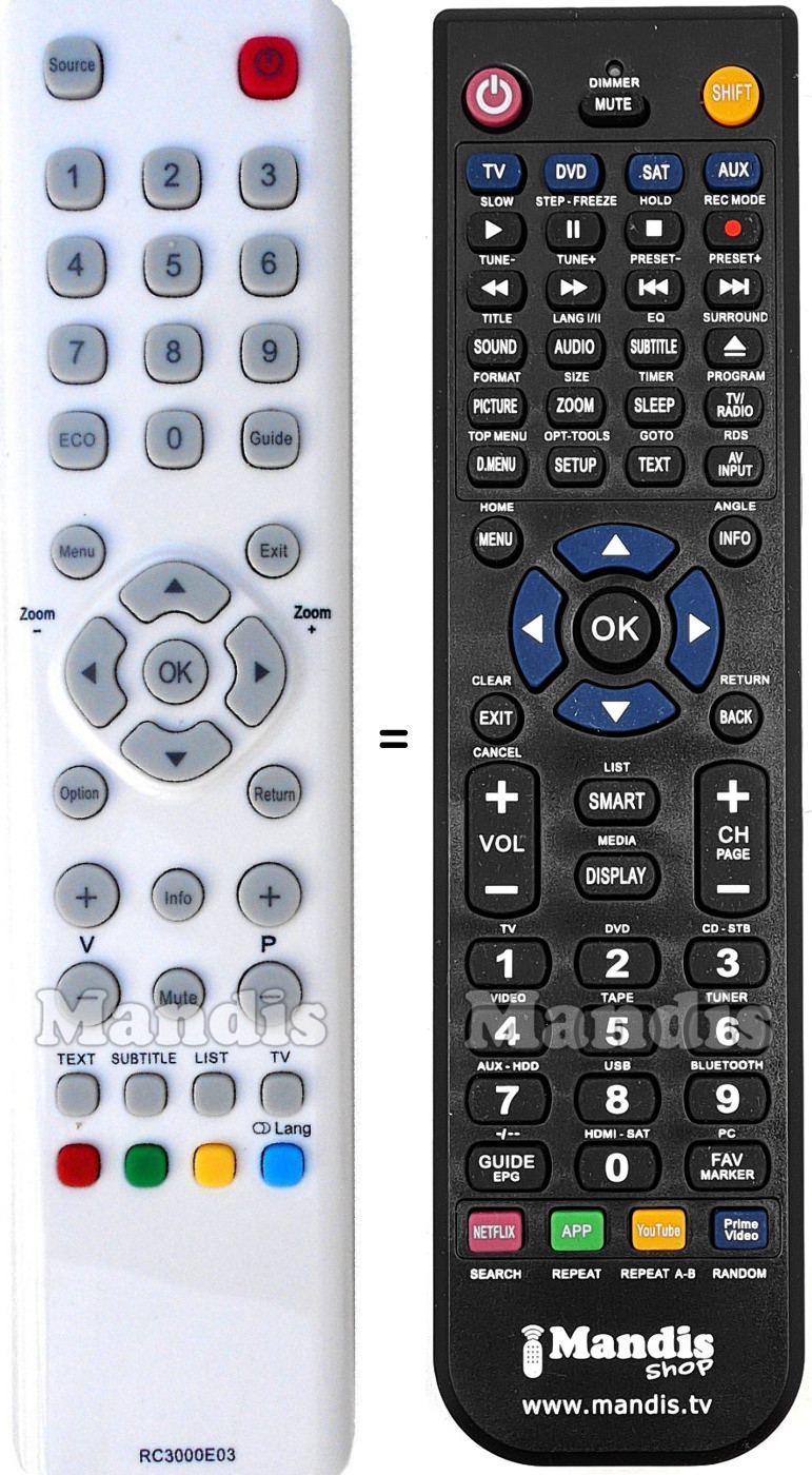 Comando à distância que substitui o original RC3000E03 em todas as suas funções.
