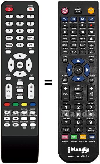Abaixo, mostraremos a correspondência entre cada botão no controle remoto original e o botão que executa a mesma função no controle remoto de substituição. Em alguns casos, pode ser necessário pressionar a tecla SHIFT antes de pressionar outro botão para realizar determinadas ações. Essas funções adicionais geralmente não são amplamente utilizadas e são incluídas para facilitar o entendimento do controle remoto de substituição, ou porque o controle remoto original tem mais botões do que seu equivalente.