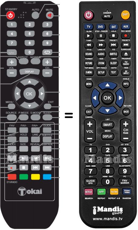 Abaixo, mostraremos a correspondência entre cada botão no controle remoto original e o botão que executa a mesma função no controle remoto de substituição. Em alguns casos, pode ser necessário pressionar a tecla SHIFT antes de pressionar outro botão para realizar determinadas ações. Essas funções adicionais geralmente não são amplamente utilizadas e são incluídas para facilitar o entendimento do controle remoto de substituição, ou porque o controle remoto original tem mais botões do que seu equivalente.