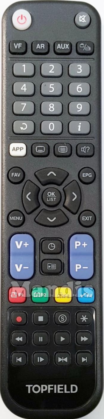 Power, Mute, VF, AR, AUX, TV / Radio, 1, 2, 3, 4, 5, 6, 7, 8, 9, 0, Recall, i, APP, Subtitle, Text, Audio, FAV, EPG, Exit, Menu, Up, Right, Down, Left, OK / List, V +, V -, Timer, Play List, P +, P -, Red / F1, Green / F2, Yellow / F3, Blue / F4, Rec, Stop, S, *, <<, Pause, Play, >>, I<, I>, >I<, >I