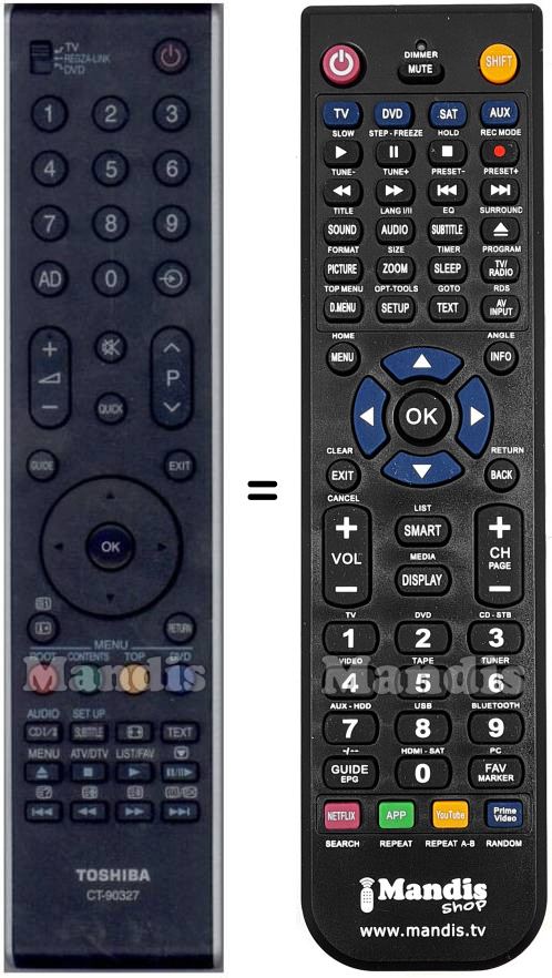 Abaixo, mostraremos a correspondência entre cada botão no controle remoto original e o botão que executa a mesma função no controle remoto de substituição. Em alguns casos, pode ser necessário pressionar a tecla SHIFT antes de pressionar outro botão para realizar determinadas ações. Essas funções adicionais geralmente não são amplamente utilizadas e são incluídas para facilitar o entendimento do controle remoto de substituição, ou porque o controle remoto original tem mais botões do que seu equivalente.