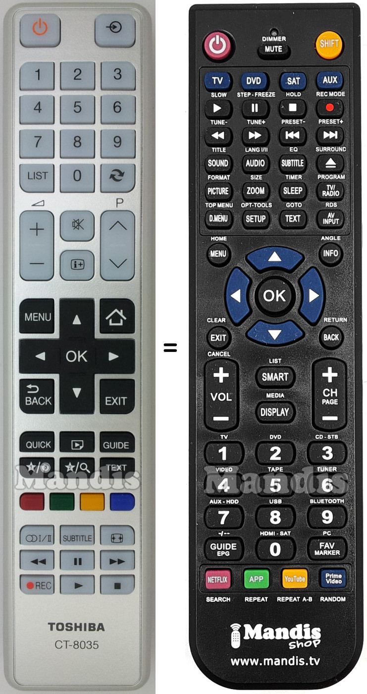 Abaixo, mostraremos a correspondência entre cada botão no controle remoto original e o botão que executa a mesma função no controle remoto de substituição. Em alguns casos, pode ser necessário pressionar a tecla SHIFT antes de pressionar outro botão para realizar determinadas ações. Essas funções adicionais geralmente não são amplamente utilizadas e são incluídas para facilitar o entendimento do controle remoto de substituição, ou porque o controle remoto original tem mais botões do que seu equivalente.